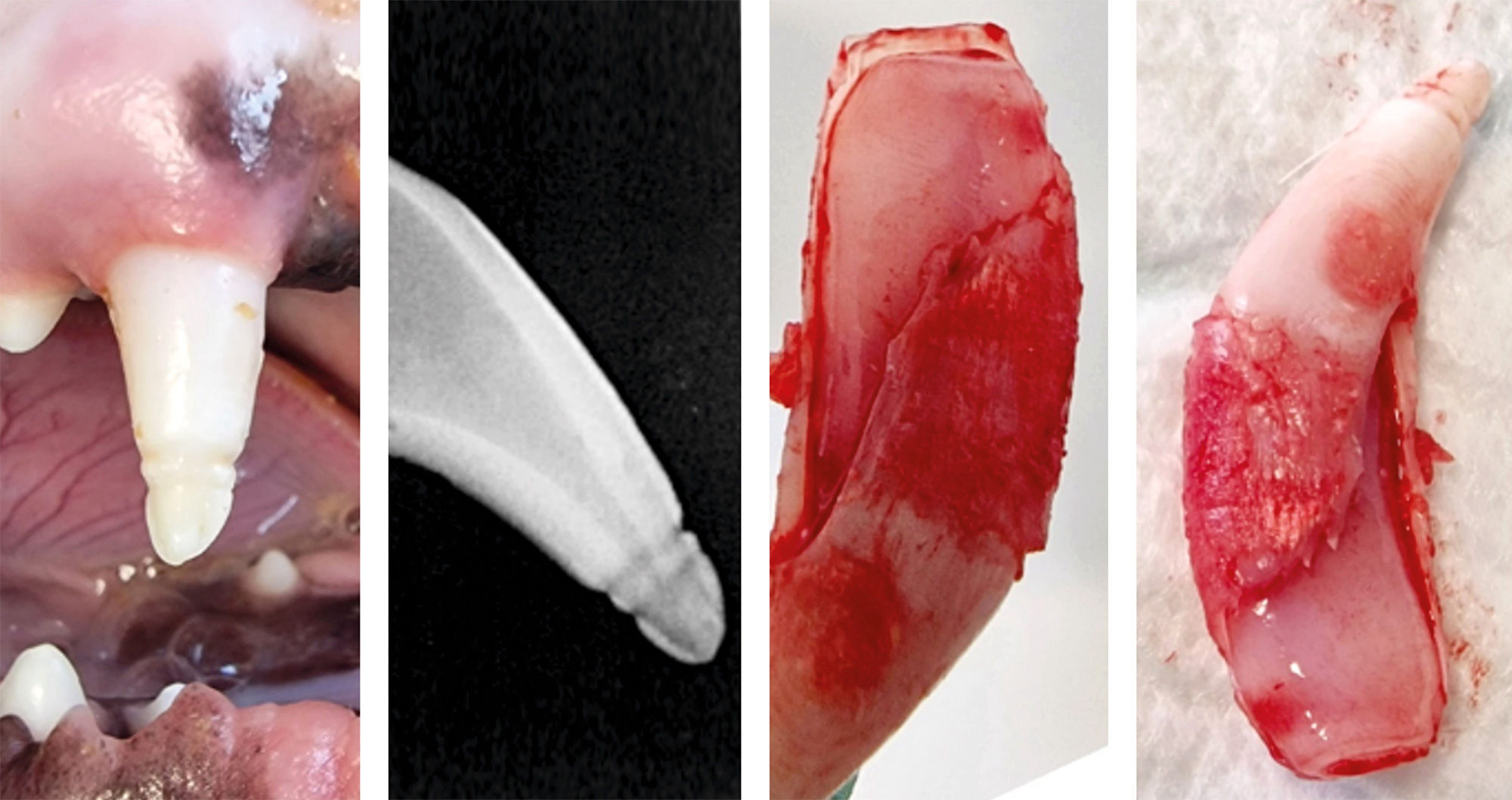 Figure 2 | Clinical and radiological aspect of the canine tooth’ crown, and clinical post extraction aspect of the dental pulp. Note the large pulp chamber and the apex closure. The dental pulp showed no signs of hyperemia, necrosis or any other dental pulp pathologies. Immunization of the patient started at the approximate age of two months with a vaccine consisted of live, attenuated CDV and combined with attenuated canine parvovirus vaccine. After two weeks the vaccine consisted of live, attenuated CDV, and attenuated adenovirus type 2, parvovirus and parainfluenza virus. After another two weeks the patient received live, attenuated CDV, adenovirus type 2, parvovirus, parainfluenza virus and Leptospira and it was repeated at fourteen days. The neurologic examination revealed no signs of injury or disease of the brain, cerebrum, diencephalon, vestibular, cranial nerves, dysfunction in walking or in any other reflexes.