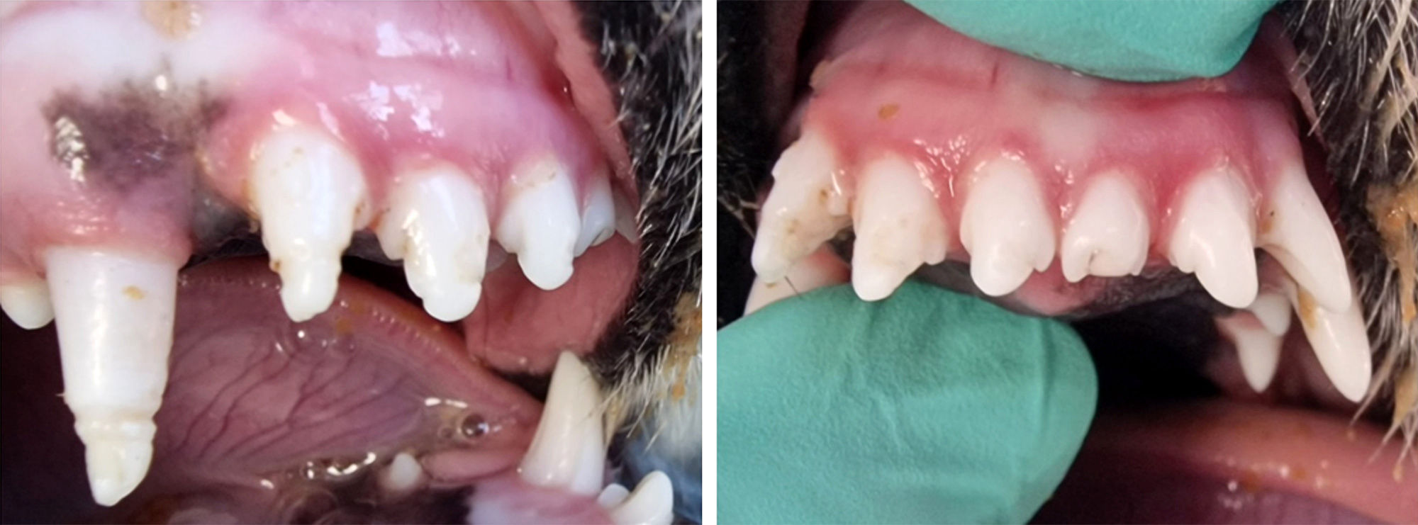 The second would be to fill the grooves with light-curing composite. Given the fact that the incisor teeth and the canine tooth are teeth involved in prehension, incision and tearing, a small layer of composite would not offer a stable, long-term therapeutical solution. Most surely, it would be chopped or fallen out in a variable period of time involving another general anaesthesia for our patient. Beside the medical aspect of several general anaesthesias to be performed, the economic aspect is not to be neglected. The third restorative solution in these pathologies are prosthetic crowns. Prosthodontic crowns would involve preparing the teeth, involving or not an endodontic treatment, a session for impression and a session for applying the crowns. The costs would be higher, and would imply two general anaesthesias and additionally radiological surveillance annually. Dental X-rays in veterinary dentistry are obtained in general anaesthesia. Again, a dental treatment rejected by the owners. The fourth therapeutic approach, according to Boy et al., would be application of a dental sealant or bonding. These applications need to be renewed every six months. Owner refused this approach. Smoothing of the teeth was rejected by the medical team as it would have compromised the resistance of the tip of the affected teeth and would have sensibilized the teeth. The long-term accepted method was closed or surgical extractions (depending on the local conditions) of the affected teeth.